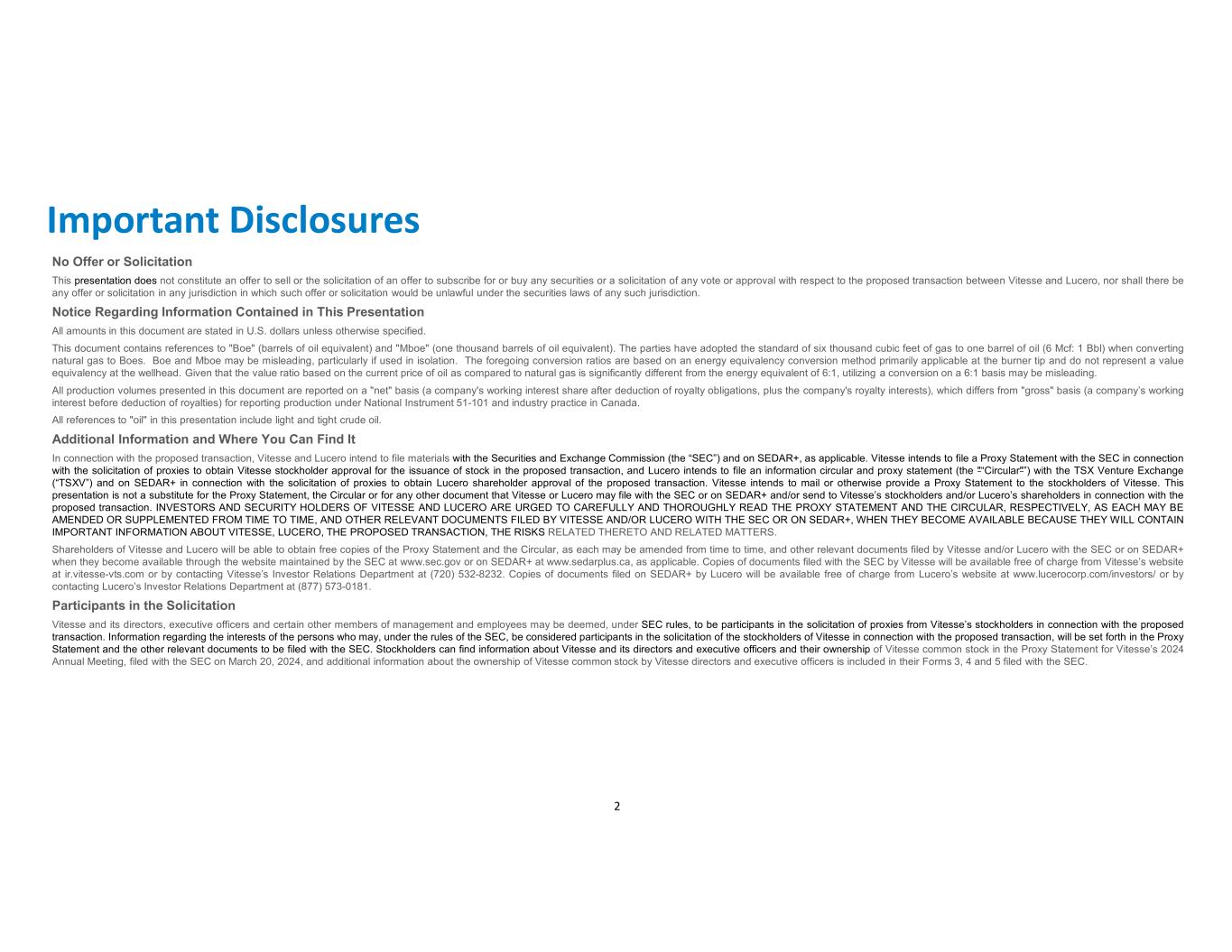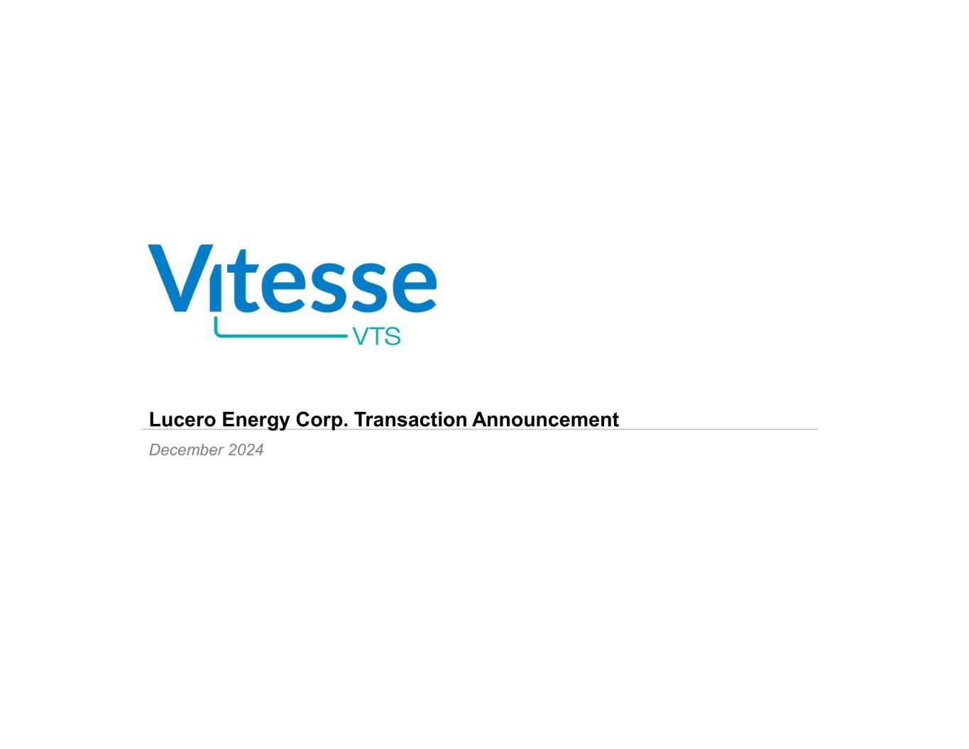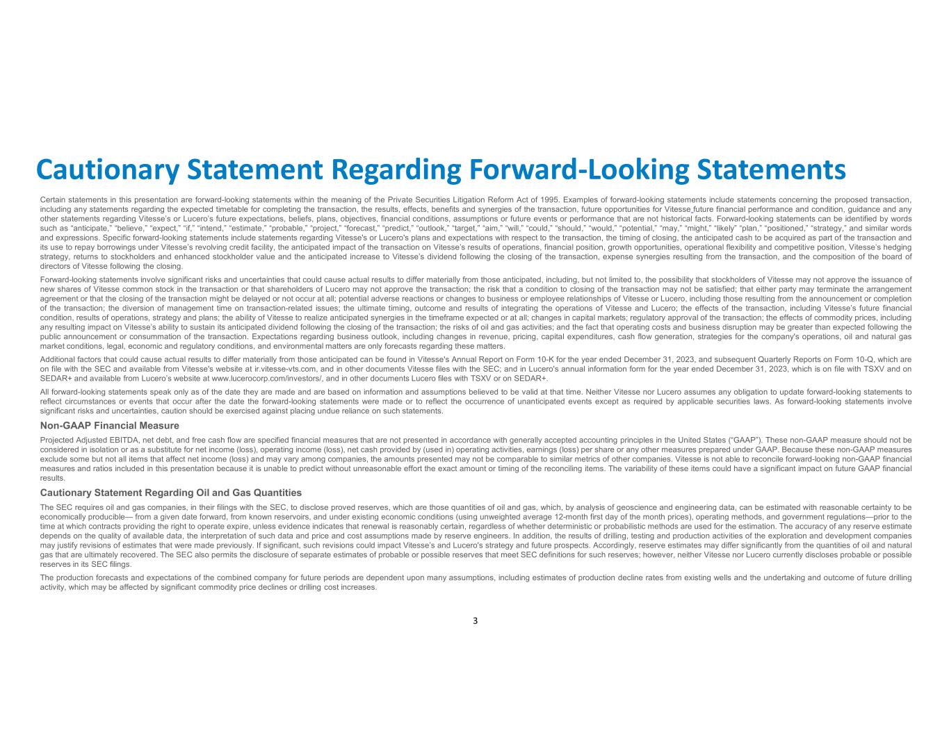2 No Offer or Solicitation This presentation does not constitute an offer to sell or the solicitation of an offer to subscribe for or buy any securities or a solicitation of any vote or approval with respect to the proposed transaction between Vitesse and Lucero, nor shall there be any offer or solicitation in any jurisdiction in which such offer or solicitation would be unlawful under the securities laws of any such jurisdiction. Notice Regarding Information Contained in This Presentation All amounts in this document are stated in U.S. dollars unless otherwise specified. This document contains references to "Boe" (barrels of oil equivalent) and "Mboe" (one thousand barrels of oil equivalent). The parties have adopted the standard of six thousand cubic feet of gas to one barrel of oil (6 Mcf: 1 Bbl) when converting natural gas to Boes. Boe and Mboe may be misleading, particularly if used in isolation. The foregoing conversion ratios are based on an energy equivalency conversion method primarily applicable at the burner tip and do not represent a value equivalency at the wellhead. Given that the value ratio based on the current price of oil as compared to natural gas is significantly different from the energy equivalent of 6:1, utilizing a conversion on a 6:1 basis may be misleading. All production volumes presented in this document are reported on a "net" basis (a company's working interest share after deduction of royalty obligations, plus the company's royalty interests), which differs from "gross" basis (a company’s working interest before deduction of royalties) for reporting production under National Instrument 51-101 and industry practice in Canada. All references to "oil" in this presentation include light and tight crude oil. Additional Information and Where You Can Find It In connection with the proposed transaction, Vitesse and Lucero intend to file materials with the Securities and Exchange Commission (the “SEC”) and on SEDAR+, as applicable. Vitesse intends to file a Proxy Statement with the SEC in connection with the solicitation of proxies to obtain Vitesse stockholder approval for the issuance of stock in the proposed transaction, and Lucero intends to file an information circular and proxy statement (the "“Circular"”) with the TSX Venture Exchange (“TSXV”) and on SEDAR+ in connection with the solicitation of proxies to obtain Lucero shareholder approval of the proposed transaction. Vitesse intends to mail or otherwise provide a Proxy Statement to the stockholders of Vitesse. This presentation is not a substitute for the Proxy Statement, the Circular or for any other document that Vitesse or Lucero may file with the SEC or on SEDAR+ and/or send to Vitesse’s stockholders and/or Lucero’s shareholders in connection with the proposed transaction. INVESTORS AND SECURITY HOLDERS OF VITESSE AND LUCERO ARE URGED TO CAREFULLY AND THOROUGHLY READ THE PROXY STATEMENT AND THE CIRCULAR, RESPECTIVELY, AS EACH MAY BE AMENDED OR SUPPLEMENTED FROM TIME TO TIME, AND OTHER RELEVANT DOCUMENTS FILED BY VITESSE AND/OR LUCERO WITH THE SEC OR ON SEDAR+, WHEN THEY BECOME AVAILABLE BECAUSE THEY WILL CONTAIN IMPORTANT INFORMATION ABOUT VITESSE, LUCERO, THE PROPOSED TRANSACTION, THE RISKS RELATED THERETO AND RELATED MATTERS. Shareholders of Vitesse and Lucero will be able to obtain free copies of the Proxy Statement and the Circular, as each may be amended from time to time, and other relevant documents filed by Vitesse and/or Lucero with the SEC or on SEDAR+ when they become available through the website maintained by the SEC at www.sec.gov or on SEDAR+ at www.sedarplus.ca, as applicable. Copies of documents filed with the SEC by Vitesse will be available free of charge from Vitesse’s website at ir.vitesse-vts.com or by contacting Vitesse’s Investor Relations Department at (720) 532-8232. Copies of documents filed on SEDAR+ by Lucero will be available free of charge from Lucero’s website at www.lucerocorp.com/investors/ or by contacting Lucero’s Investor Relations Department at (877) 573-0181. Participants in the Solicitation Vitesse and its directors, executive officers and certain other members of management and employees may be deemed, under SEC rules, to be participants in the solicitation of proxies from Vitesse’s stockholders in connection with the proposed transaction. Information regarding the interests of the persons who may, under the rules of the SEC, be considered participants in the solicitation of the stockholders of Vitesse in connection with the proposed transaction, will be set forth in the Proxy Statement and the other relevant documents to be filed with the SEC. Stockholders can find information about Vitesse and its directors and executive officers and their ownership of Vitesse common stock in the Proxy Statement for Vitesse’s 2024 Annual Meeting, filed with the SEC on March 20, 2024, and additional information about the ownership of Vitesse common stock by Vitesse directors and executive officers is included in their Forms 3, 4 and 5 filed with the SEC. Important Disclosures