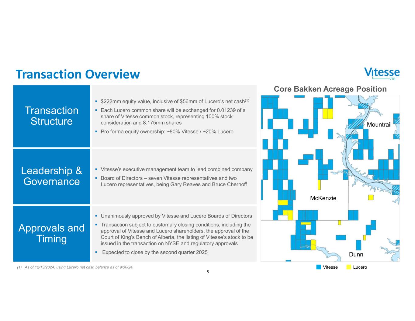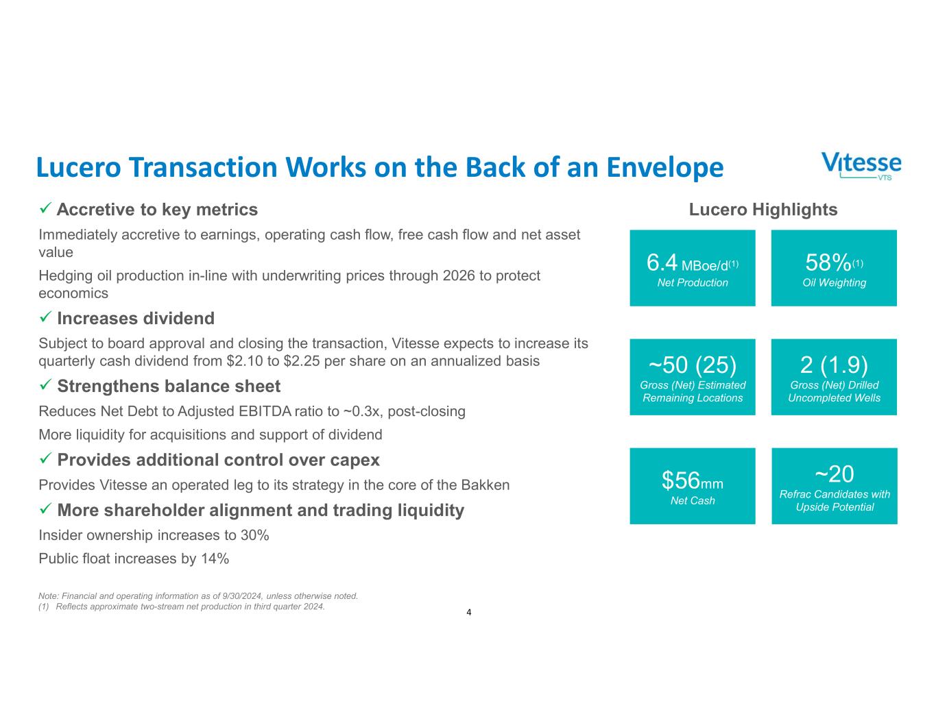 3 Certain statements in this presentation are forward-looking statements within the meaning of the Private Securities Litigation Reform Act of 1995. Examples of forward-looking statements include statements concerning the proposed transaction, including any statements regarding the expected timetable for completing the transaction, the results, effects, benefits and synergies of the transaction, future opportunities for Vitesse future financial performance and condition, guidance and any other statements regarding Vitesse’s or Lucero’s future expectations, beliefs, plans, objectives, financial conditions, assumptions or future events or performance that are not historical facts. Forward-looking statements can be identified by words such as “anticipate,” “believe,” “expect,” “if,” “intend,” “estimate,” “probable,” “project,” “forecast,” “predict,” “outlook,” “target,” “aim,” “will,” “could,” “should,” “would,” “potential,” “may,” “might,” “likely” “plan,” “positioned,” “strategy,” and similar words and expressions. Specific forward-looking statements include statements regarding Vitesse's or Lucero's plans and expectations with respect to the transaction, the timing of closing, the anticipated cash to be acquired as part of the transaction and its use to repay borrowings under Vitesse’s revolving credit facility, the anticipated impact of the transaction on Vitesse’s results of operations, financial position, growth opportunities, operational flexibility and competitive position, Vitesse’s hedging strategy, returns to stockholders and enhanced stockholder value and the anticipated increase to Vitesse’s dividend following the closing of the transaction, expense synergies resulting from the transaction, and the composition of the board of directors of Vitesse following the closing. Forward-looking statements involve significant risks and uncertainties that could cause actual results to differ materially from those anticipated, including, but not limited to, the possibility that stockholders of Vitesse may not approve the issuance of new shares of Vitesse common stock in the transaction or that shareholders of Lucero may not approve the transaction; the risk that a condition to closing of the transaction may not be satisfied; that either party may terminate the arrangement agreement or that the closing of the transaction might be delayed or not occur at all; potential adverse reactions or changes to business or employee relationships of Vitesse or Lucero, including those resulting from the announcement or completion of the transaction; the diversion of management time on transaction-related issues; the ultimate timing, outcome and results of integrating the operations of Vitesse and Lucero; the effects of the transaction, including Vitesse’s future financial condition, results of operations, strategy and plans; the ability of Vitesse to realize anticipated synergies in the timeframe expected or at all; changes in capital markets; regulatory approval of the transaction; the effects of commodity prices, including any resulting impact on Vitesse’s ability to sustain its anticipated dividend following the closing of the transaction; the risks of oil and gas activities; and the fact that operating costs and business disruption may be greater than expected following the public announcement or consummation of the transaction. Expectations regarding business outlook, including changes in revenue, pricing, capital expenditures, cash flow generation, strategies for the company's operations, oil and natural gas market conditions, legal, economic and regulatory conditions, and environmental matters are only forecasts regarding these matters. Additional factors that could cause actual results to differ materially from those anticipated can be found in Vitesse's Annual Report on Form 10-K for the year ended December 31, 2023, and subsequent Quarterly Reports on Form 10-Q, which are on file with the SEC and available from Vitesse's website at ir.vitesse-vts.com, and in other documents Vitesse files with the SEC; and in Lucero's annual information form for the year ended December 31, 2023, which is on file with TSXV and on SEDAR+ and available from Lucero’s website at www.lucerocorp.com/investors/, and in other documents Lucero files with TSXV or on SEDAR+. All forward-looking statements speak only as of the date they are made and are based on information and assumptions believed to be valid at that time. Neither Vitesse nor Lucero assumes any obligation to update forward-looking statements to reflect circumstances or events that occur after the date the forward-looking statements were made or to reflect the occurrence of unanticipated events except as required by applicable securities laws. As forward-looking statements involve significant risks and uncertainties, caution should be exercised against placing undue reliance on such statements. Non-GAAP Financial Measure Projected Adjusted EBITDA, net debt, and free cash flow are specified financial measures that are not presented in accordance with generally accepted accounting principles in the United States (“GAAP”). These non-GAAP measure should not be considered in isolation or as a substitute for net income (loss), operating income (loss), net cash provided by (used in) operating activities, earnings (loss) per share or any other measures prepared under GAAP. Because these non-GAAP measures exclude some but not all items that affect net income (loss) and may vary among companies, the amounts presented may not be comparable to similar metrics of other companies. Vitesse is not able to reconcile forward-looking non-GAAP financial measures and ratios included in this presentation because it is unable to predict without unreasonable effort the exact amount or timing of the reconciling items. The variability of these items could have a signif