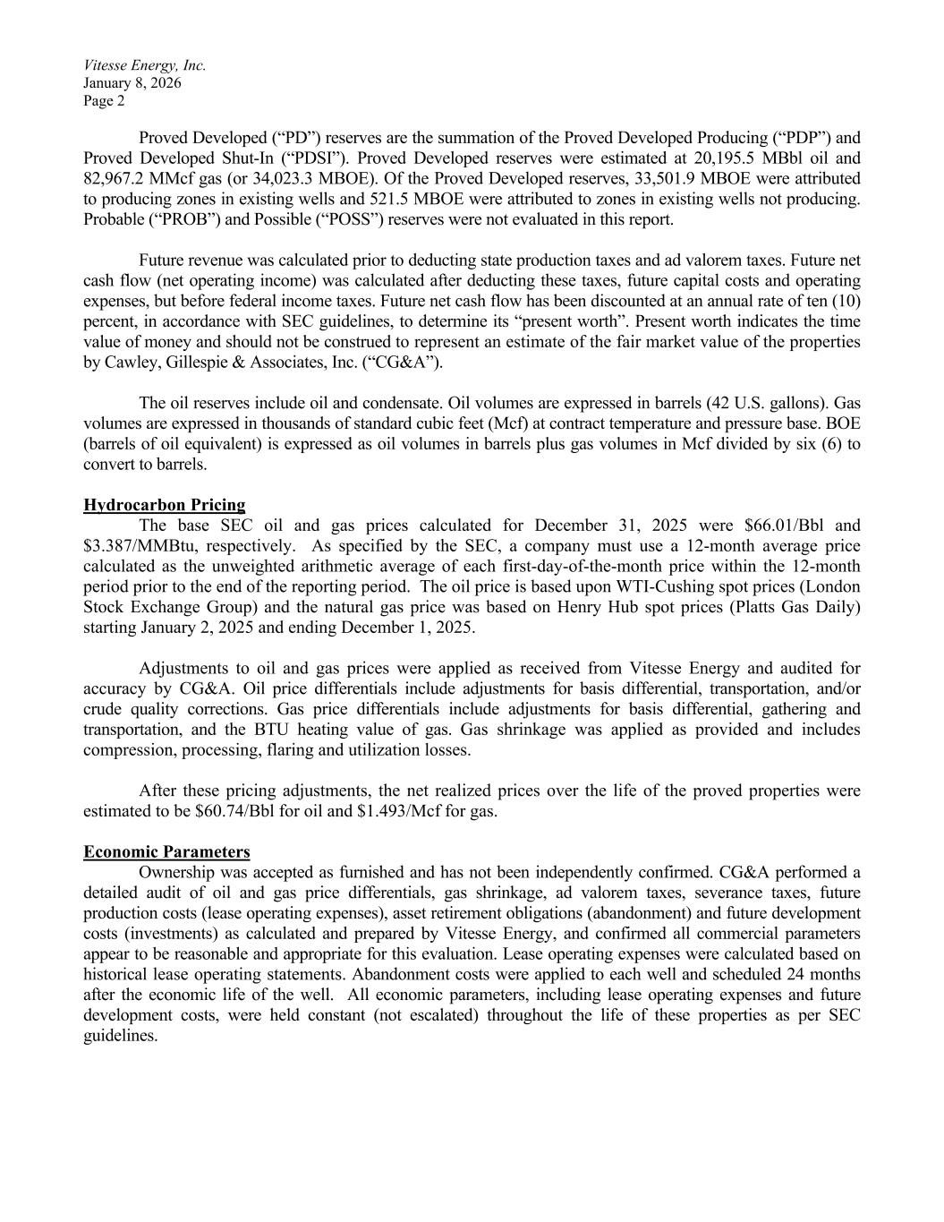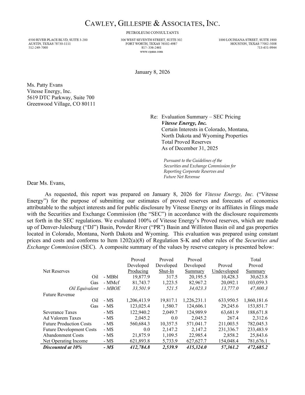 Vitesse Energy, Inc. January 8, 2026 Page 2 Proved Developed (“PD”) reserves are the summation of the Proved Developed Producing (“PDP”) and Proved Developed Shut-In (“PDSI”). Proved Developed reserves were estimated at 20,195.5 MBbl oil and 82,967.2 MMcf gas (or 34,023.3 MBOE). Of the Proved Developed reserves, 33,501.9 MBOE were attributed to producing zones in existing wells and 521.5 MBOE were attributed to zones in existing wells not producing. Probable (“PROB”) and Possible (“POSS”) reserves were not evaluated in this report. Future revenue was calculated prior to deducting state production taxes and ad valorem taxes. Future net cash flow (net operating income) was calculated after deducting these taxes, future capital costs and operating expenses, but before federal income taxes. Future net cash flow has been discounted at an annual rate of ten (10) percent, in accordance with SEC guidelines, to determine its “present worth”. Present worth indicates the time value of money and should not be construed to represent an estimate of the fair market value of the properties by Cawley, Gillespie & Associates, Inc. (“CG&A”). The oil reserves include oil and condensate. Oil volumes are expressed in barrels (42 U.S. gallons). Gas volumes are expressed in thousands of standard cubic feet (Mcf) at contract temperature and pressure base. BOE (barrels of oil equivalent) is expressed as oil volumes in barrels plus gas volumes in Mcf divided by six (6) to convert to barrels. Hydrocarbon Pricing The base SEC oil and gas prices calculated for December 31, 2025 were $66.01/Bbl and $3.387/MMBtu, respectively. As specified by the SEC, a company must use a 12-month average price calculated as the unweighted arithmetic average of each first-day-of-the-month price within the 12-month period prior to the end of the reporting period. The oil price is based upon WTI-Cushing spot prices (London Stock Exchange Group) and the natural gas price was based on Henry Hub spot prices (Platts Gas Daily) starting January 2, 2025 and ending December 1, 2025. Adjustments to oil and gas prices were applied as received from Vitesse Energy and audited for accuracy by CG&A. Oil price differentials include adjustments for basis differential, transportation, and/or crude quality corrections. Gas price differentials include adjustments for basis differential, gathering and transportation, and the BTU heating value of gas. Gas shrinkage was applied as provided and includes compression, processing, flaring and utilization losses. After these pricing adjustments, the net realized prices over the life of the proved properties were estimated to be $60.74/Bbl for oil and $1.493/Mcf for gas. Economic Parameters Ownership was accepted as furnished and has not been independently confirmed. CG&A performed a detailed audit of oil and gas price differentials, gas shrinkage, ad valorem taxes, severance taxes, future production costs (lease operating expenses), asset retirement obligations (abandonment) and future development costs (investments) as calculated and prepared by Vitesse Energy, and confirmed all commercial parameters appear to be reasonable and appropriate for this evaluation. Lease operating expenses were calculated based on historical lease operating statements. Abandonment costs were applied to each well and scheduled 24 months after the economic life of the well. All economic parameters, including lease operating expenses and future development costs, were held constant (not escalated) throughout the life of these properties as per SEC guidelines.