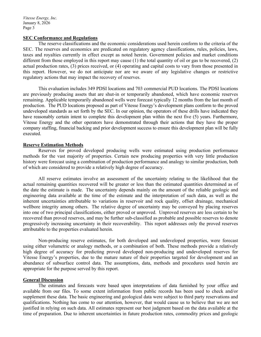 Vitesse Energy, Inc. January 8, 2026 Page 3 SEC Conformance and Regulations The reserve classifications and the economic considerations used herein conform to the criteria of the SEC. The reserves and economics are predicated on regulatory agency classifications, rules, policies, laws, taxes and royalties currently in effect except as noted herein. Government policies and market conditions different from those employed in this report may cause (1) the total quantity of oil or gas to be recovered, (2) actual production rates, (3) prices received, or (4) operating and capital costs to vary from those presented in this report. However, we do not anticipate nor are we aware of any legislative changes or restrictive regulatory actions that may impact the recovery of reserves. This evaluation includes 349 PDSI locations and 703 commercial PUD locations. The PDSI locations are previously producing assets that are shut-in or temporarily abandoned, which have economic reserves remaining. Applicable temporarily abandoned wells were forecast typically 12 months from the last month of production. The PUD locations proposed as part of Vitesse Energy’s development plans conform to the proved undeveloped standards as set forth by the SEC. In our opinion, the operators of these drills have indicated they have reasonably certain intent to complete this development plan within the next five (5) years. Furthermore, Vitesse Energy and the other operators have demonstrated through their actions that they have the proper company staffing, financial backing and prior development success to ensure this development plan will be fully executed. Reserve Estimation Methods Reserves for proved developed producing wells were estimated using production performance methods for the vast majority of properties. Certain new producing properties with very little production history were forecast using a combination of production performance and analogy to similar production, both of which are considered to provide a relatively high degree of accuracy. All reserve estimates involve an assessment of the uncertainty relating to the likelihood that the actual remaining quantities recovered will be greater or less than the estimated quantities determined as of the date the estimate is made. The uncertainty depends mainly on the amount of the reliable geologic and engineering data available at the time of the estimate and the interpretation of such data, as well as the inherent uncertainties attributable to variations in reservoir and rock quality, offset drainage, mechanical wellbore integrity among others. The relative degree of uncertainty may be conveyed by placing reserves into one of two principal classifications, either proved or unproved. Unproved reserves are less certain to be recovered than proved reserves, and may be further sub-classified as probable and possible reserves to denote progressively increasing uncertainty in their recoverability. This report addresses only the proved reserves attributable to the properties evaluated herein. Non-producing reserve estimates, for both developed and undeveloped properties, were forecast using either volumetric or analogy methods, or a combination of both. These methods provide a relatively high degree of accuracy for predicting proved developed non-producing and undeveloped reserves for Vitesse Energy’s properties, due to the mature nature of their properties targeted for development and an abundance of subsurface control data. The assumptions, data, methods and procedures used herein are appropriate for the purpose served by this report. General Discussion The estimates and forecasts were based upon interpretations of data furnished by your office and available from our files. To some extent information from public records has been used to check and/or supplement these data. The basic engineering and geological data were subject to third party reservations and qualifications. Nothing has come to our attention, however, that would cause us to believe that we are not justified in relying on such data. All estimates represent our best judgment based on the data available at the time of preparation. Due to inherent uncertainties in future production rates, commodity prices and geologic