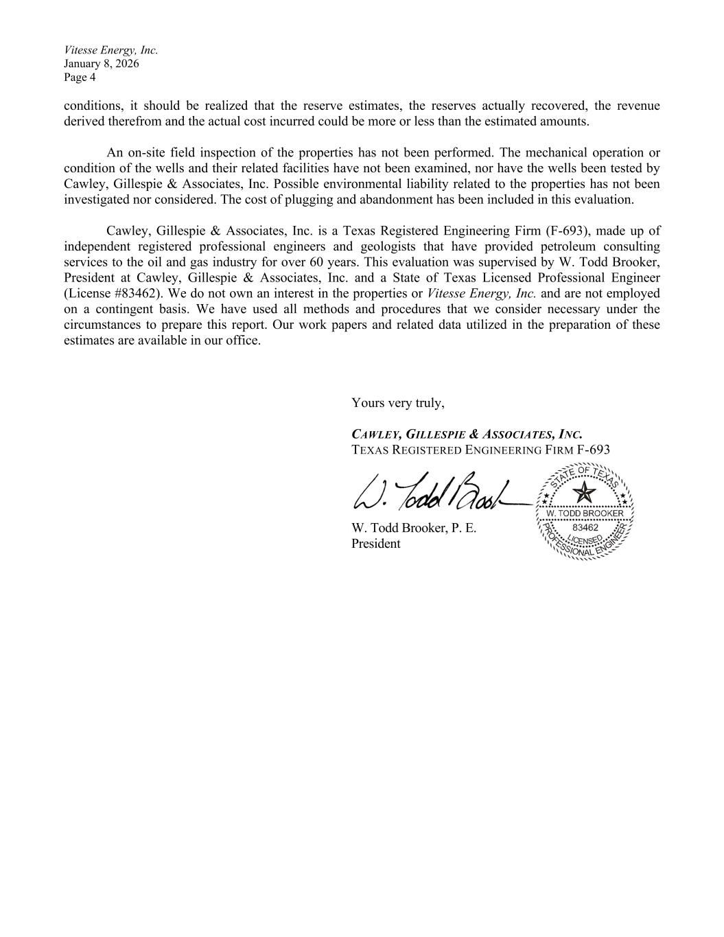 Vitesse Energy, Inc. January 8, 2026 Page 4 conditions, it should be realized that the reserve estimates, the reserves actually recovered, the revenue derived therefrom and the actual cost incurred could be more or less than the estimated amounts. An on-site field inspection of the properties has not been performed. The mechanical operation or condition of the wells and their related facilities have not been examined, nor have the wells been tested by Cawley, Gillespie & Associates, Inc. Possible environmental liability related to the properties has not been investigated nor considered. The cost of plugging and abandonment has been included in this evaluation. Cawley, Gillespie & Associates, Inc. is a Texas Registered Engineering Firm (F-693), made up of independent registered professional engineers and geologists that have provided petroleum consulting services to the oil and gas industry for over 60 years. This evaluation was supervised by W. Todd Brooker, President at Cawley, Gillespie & Associates, Inc. and a State of Texas Licensed Professional Engineer (License #83462). We do not own an interest in the properties or Vitesse Energy, Inc. and are not employed on a contingent basis. We have used all methods and procedures that we consider necessary under the circumstances to prepare this report. Our work papers and related data utilized in the preparation of these estimates are available in our office. Yours very truly, CAWLEY, GILLESPIE & ASSOCIATES, INC. TEXAS REGISTERED ENGINEERING FIRM F-693 W. Todd Brooker, P. E. President